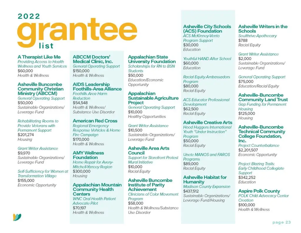 Working with our community, grantees, partners, researchers and scholars, we collaborate to create a Western North Carolina where every generation can live, learn, earn and thrive, with dignity and opportunity for all – no exceptions.